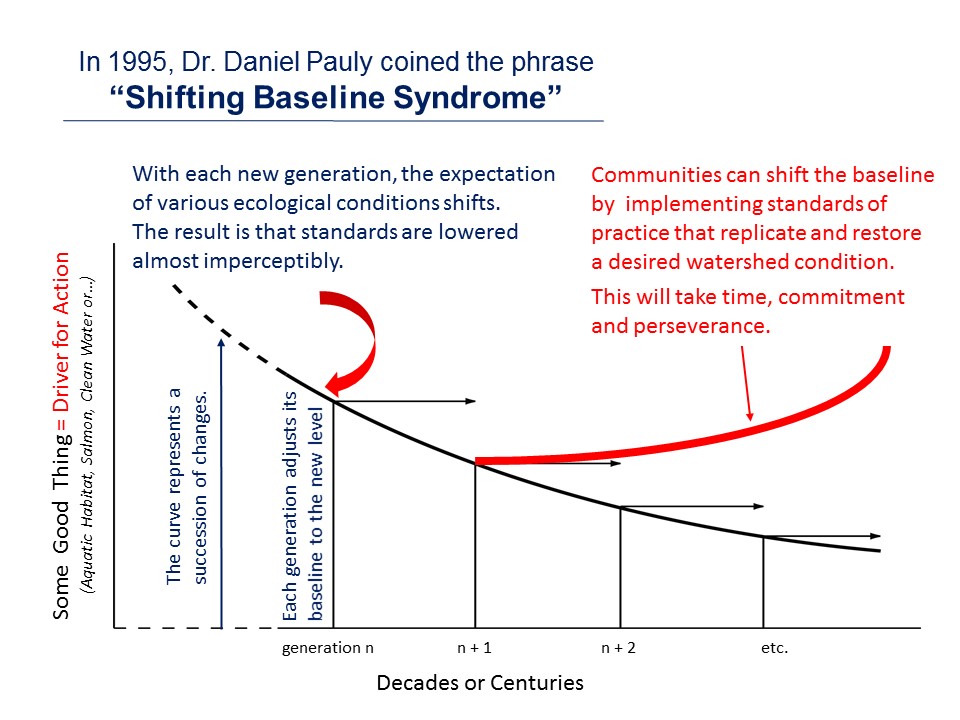Figure 1: Graph showing the impact of Shifting Baseline Syndrome and how we can reverse it (The Partnership for Water Sustainability in BC. 2016. https://waterbucket.ca/rm/2016/01/12/the-shifting-baseline-syndrome-is/ )